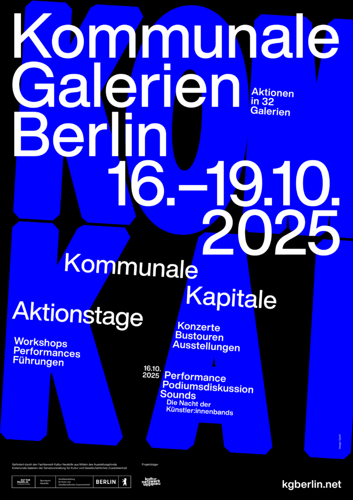 Kommunale Galerien Berlin present the first Kommunale Kapitale – Berlin Municipal Galleries Days of Action from 16 to 19 October 2025. There will be numerous exhibitions, performances, concerts, artist talks and workshops throughout Berlin.
